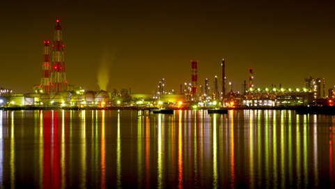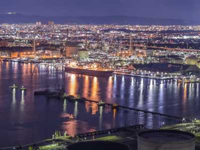 高石市の市内には石油・化学系の工場が立地しており、臨海部の工場地域が市域の約4割を占めています。そこで見られる工場夜景は、圧倒的なスケール感と、阪神高速湾岸線から望む連続したパノラマが魅力です。また、海越しに立ち並ぶ工場と、その姿が水面に映るその明かりや、水路を挟んで工場と高速道路を眺められる景観など様々な姿を見ることもできます。
