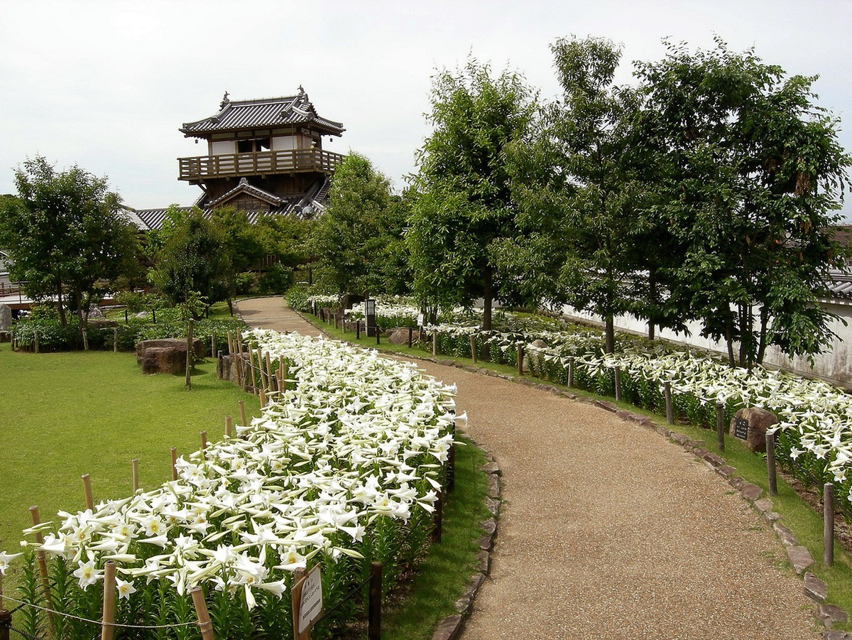 池田へは大阪・梅田から阪急電車で約20分。池田城跡公園は、かつて池田市域一帯を支配していた地方豪族・池田氏の居城跡地を整備し、平成12年に開園したもの。公園への入り口は東西南北に各一カ所ずつあるが、主要な入り口は教育センターに隣接する東門だ。幅3メートル、長さ23メートルの木橋を渡って門をくぐった園内には、日本庭園や瓦葺きを基調にした茶室、遺構復元コーナー、やぐら風の展望休憩舎などが点在。はるか市街を見渡せば巨大なハープのように見える斜張橋・新猪名川大橋(通称ビッグハープ)、晴れた日には神戸や和歌山方面までも望ることができる。土日祝日にはボランティアによるガイドが行なわれる事も。池田の歴史・文化に思いを馳せるにはぴったりだ。