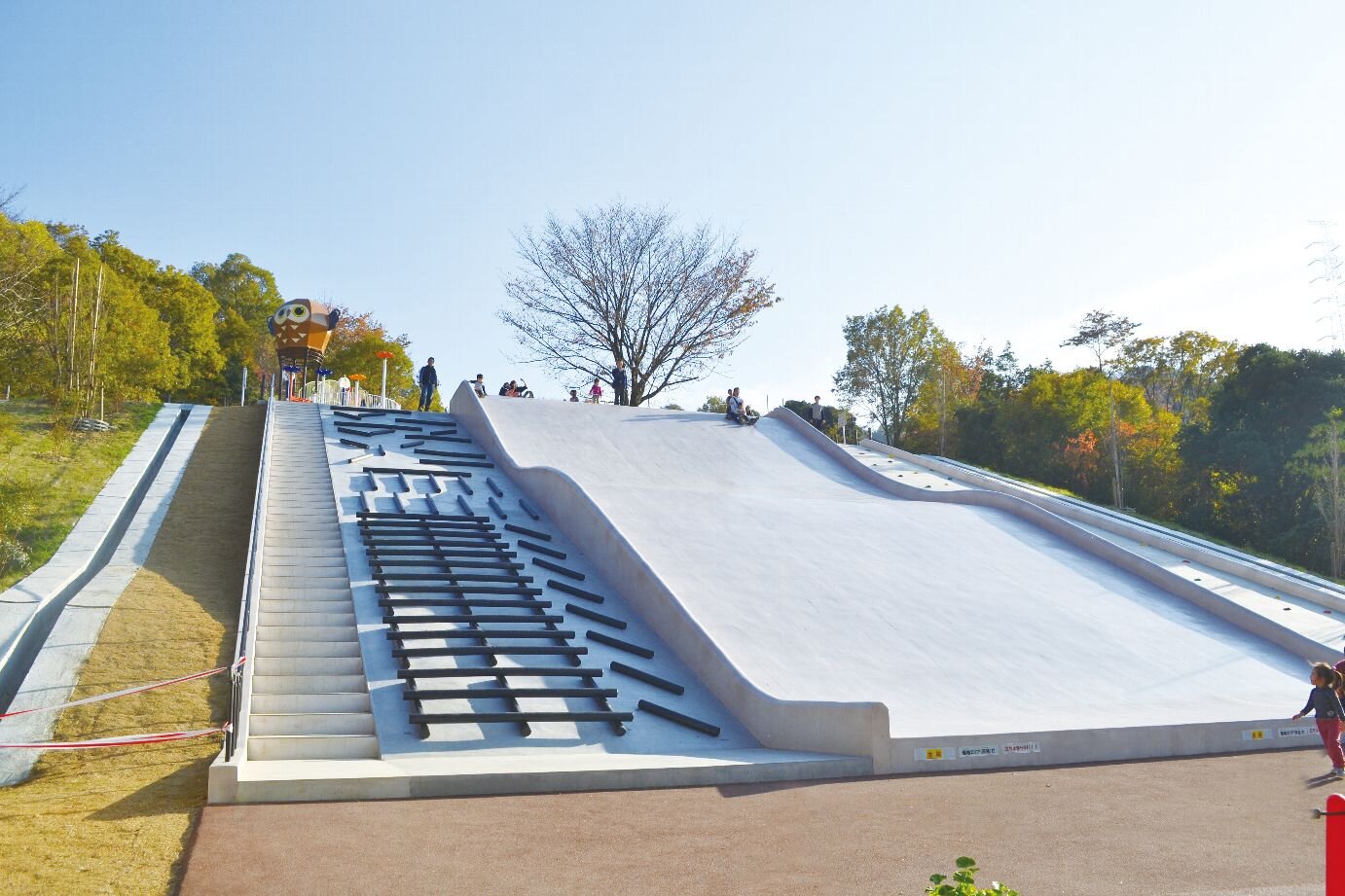 本公園は、甲子園球場の約4倍(約5ヘクタール)の広さがあり、大型複合遊具や府内最大級の大型すべり台をはじめ珍しい遊具や健康遊具、さらにはスケートボード広場もあります。