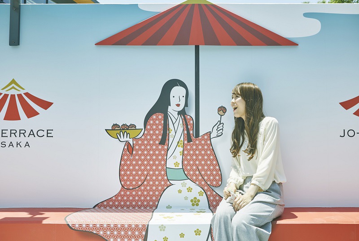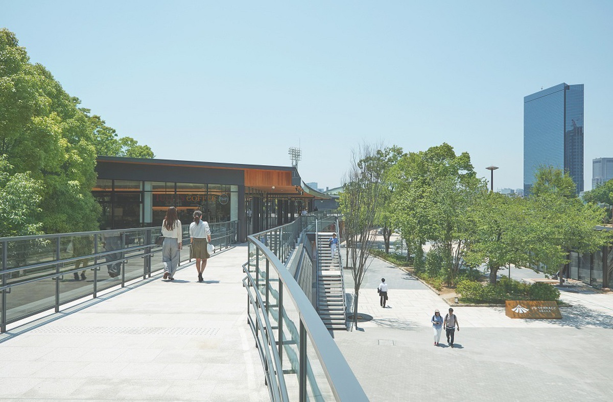 和モダンの落ち着いた空間は、なごみのテラス。公園に訪れる人々のにぎわいと自然の静寂が大阪の新しい日常をつくり出します。カフェで友達や仕事仲間と会話を楽しんだり、お気に入りのお店をのぞいてみたり・・・散歩するだけでも心地いい。大阪城公園の新しいエントランスが誕生しました。
