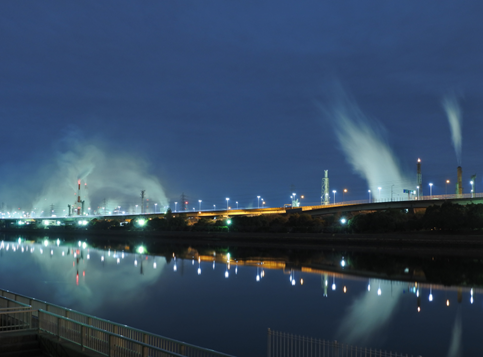 高石市の市内には石油・化学系の工場が立地しており、臨海部の工場地域が市域の約4割を占めています。そこで見られる工場夜景は、圧倒的なスケール感と、阪神高速湾岸線から望む連続したパノラマが魅力です。また、海越しに立ち並ぶ工場と、その姿が水面に映るその明かりや、水路を挟んで工場と高速道路を眺められる景観など様々な姿を見ることもできます。